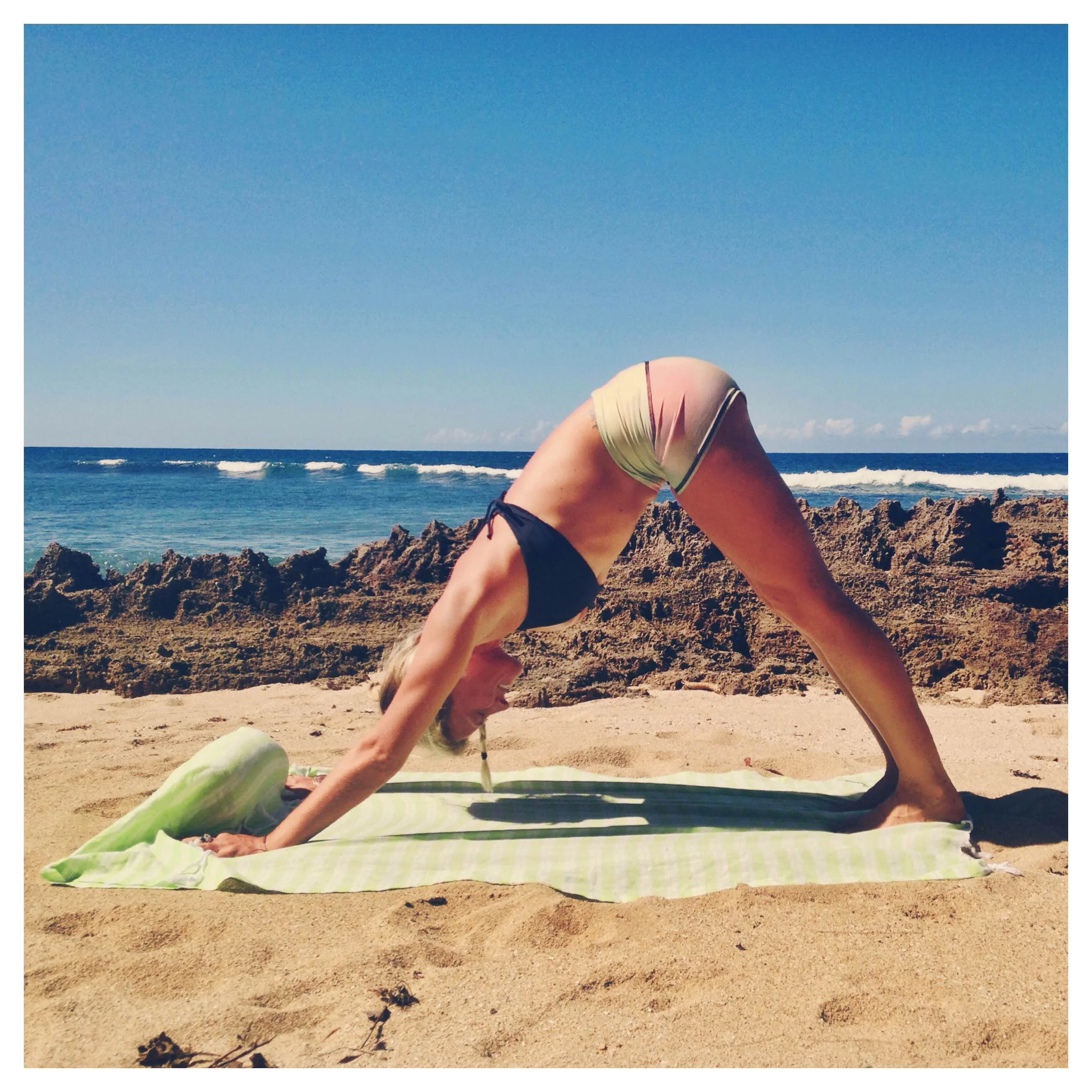 Why? Downward Dog wakes up the ENTIRE body stretching the shoulders, back, hamstrings, and calves while activating and strengthening the arms and legs. A form of inversion, this pose helps to calm the brain (before paddling out on the big days) while relieving stress and even mild depression. This pose also helps to improve digestion and relieves headaches, insomnia, back pain and fatigue.