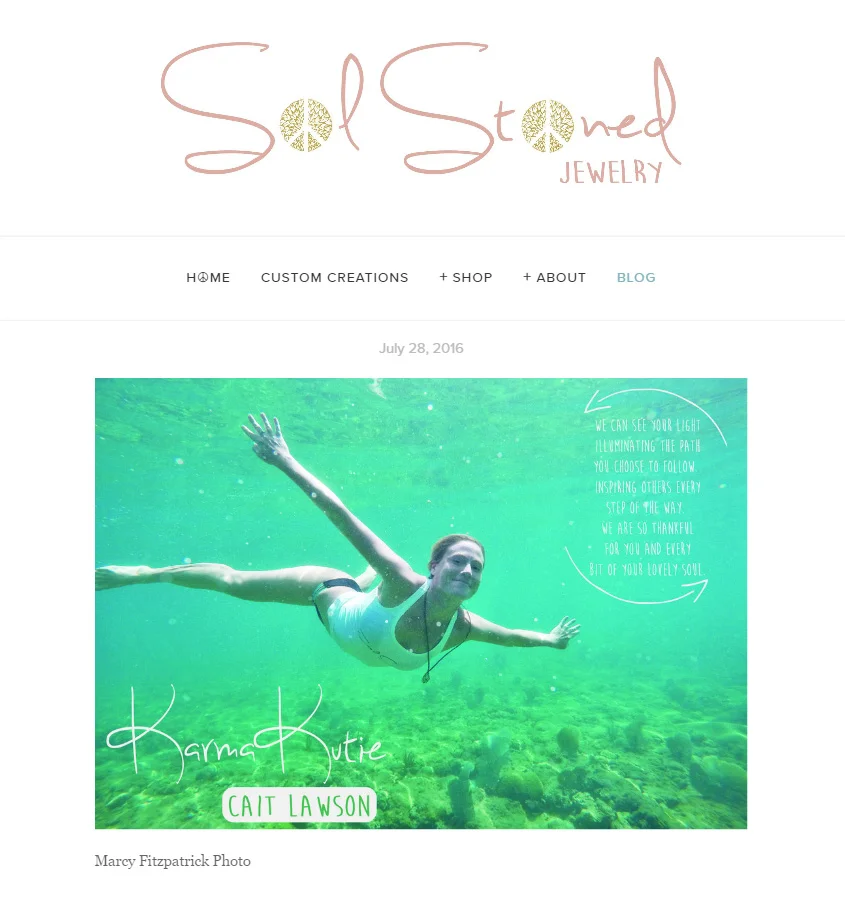 I am beyond honored to be featured as the Sol Stoned Karma Kutie for the Month of July. If you are unfamiliar Sol Stoned, I highly suggest you acquaint yourself. Sol Stoned Jewelry was created by a fellow yoga-and-ocean-lovin' sista, Lily, when she tapped into her creative prowess during her yoga teacher training in Florianopolis, Brazil. Through Sol Stoned Lily creates original and custom crystal and gemstone necklaces to promote higher vibrations for all who wear them. You can tell that she puts SO much love and energy into every piece and I seriously haven't taken my Aquamarine necklace off since I received it... It brings me so much peace and serves as a reminder to show up for life fearlessly and fluidly. I was humbled when Lily asked me to be featured as July's Karma Kutie and I am grateful for the connection that has been made between us. Be sure to follow Sol Stoned on Instagram and give her a Like on Facebook. You can purchase original necklaces and other pieces, or have your favorite crystal or stone custom wrapped by Lily, as well as learn more about crystals and healing stones through the Sol Stoned website HERE.